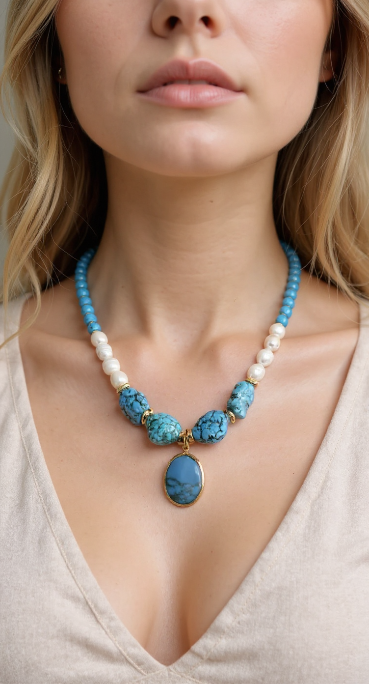 El Yapımı Turkuaz ve İnci Kolye ve Doğal Taşlı Kolye
